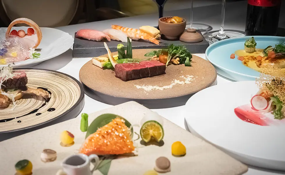 通常、当ホテルのディナーは、フレンチ・鉄板焼き・鮨からお好みの1ジャンルをお選びいただいております。本特別プランでは、3名のシェフが腕を振るう料理を一晩でご堪能いただける特別なコースをご用意しました。